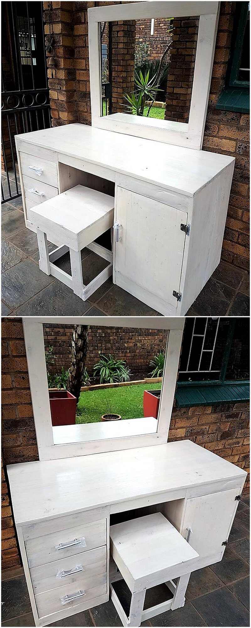 Vanity is the most important furniture piece in a girl’s room and it is not necessary to buy it with the design that is not liked by the person when it can be created at home. See the vanity created with the pallets after painting them white, there is also a stool as it is a full set.