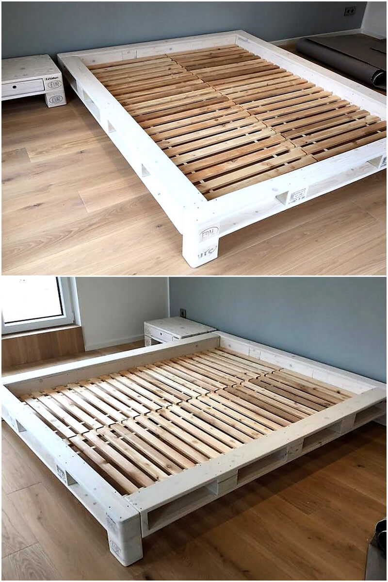 For those, who want a unique looking bed; here is the bed frame without the legs. The bed support is small wood pallet boxes and the bed is a little bit above the floor. The foam is fitted inside the space between the raised pallet border.