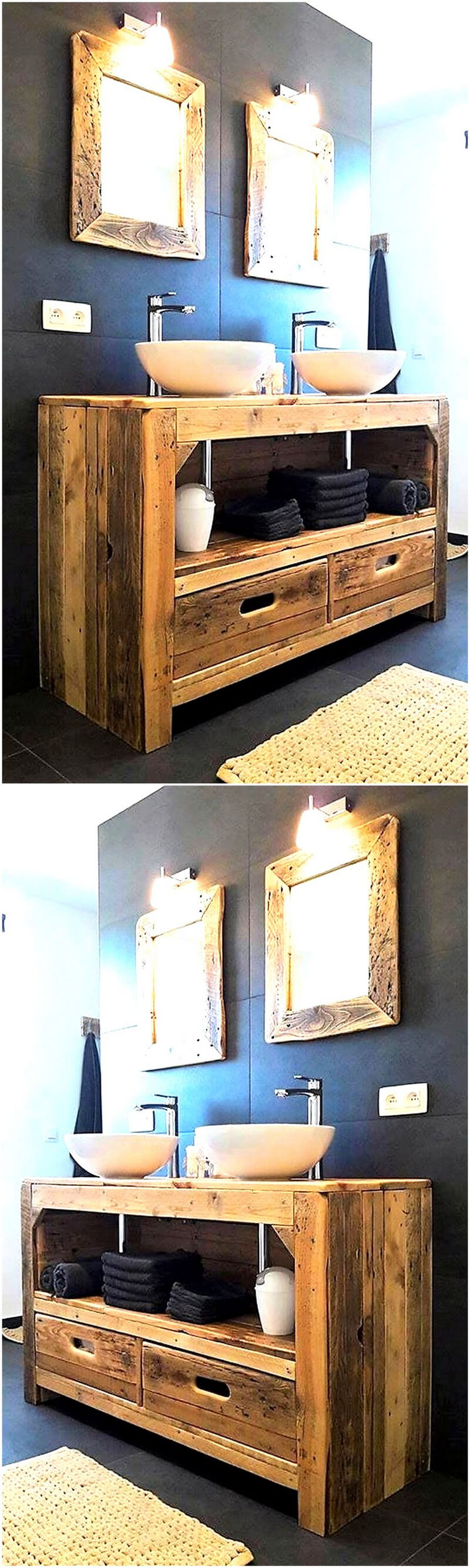 Pallets never fail to impress others because they can be reshaped into almost anything for any area; here you can see the reclaimed wood pallet rustic sink. It is making the bathroom look amazing and there are drawers as well to store the items of bathroom in an organized way.