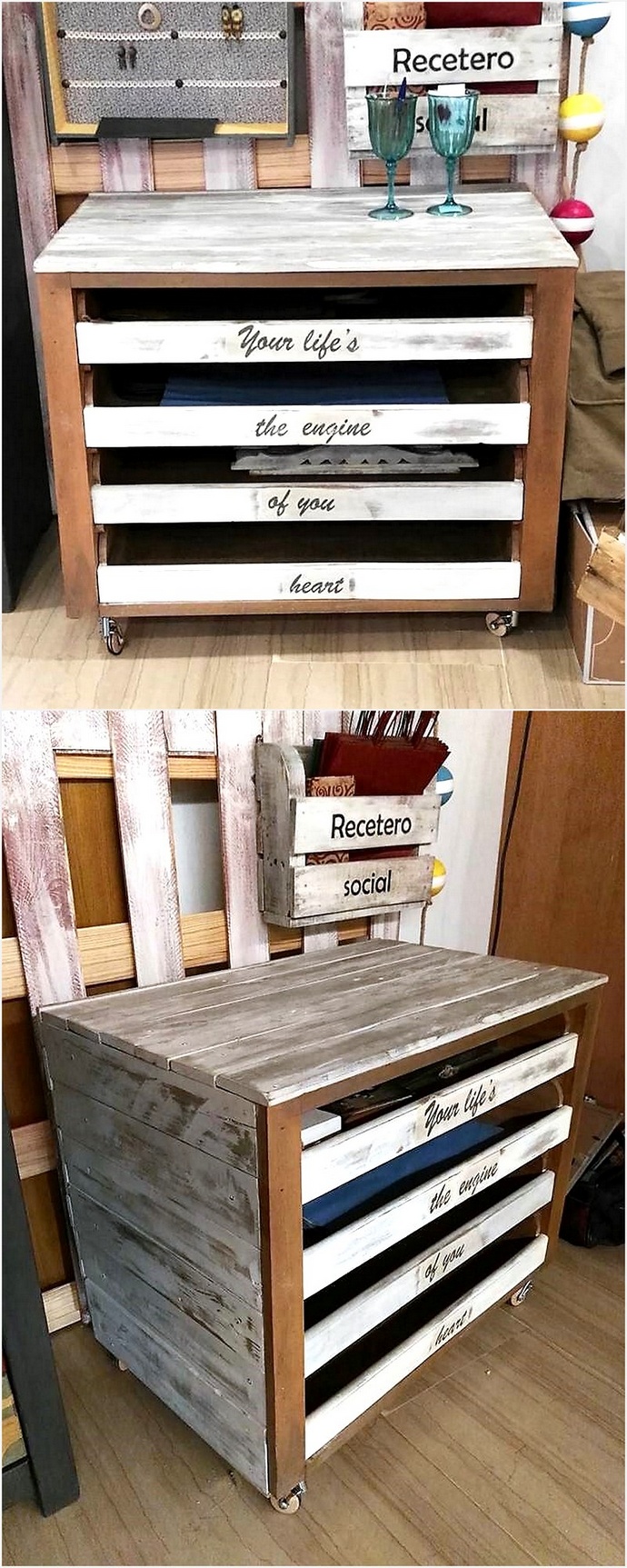 If you have reclaimed wood pallets, then think about creating a side table on wheels because it can be placed in the TV launch for placing the decorative items over it and storing the items of daily use in it. It can also be placed in the bedroom on the side of it.